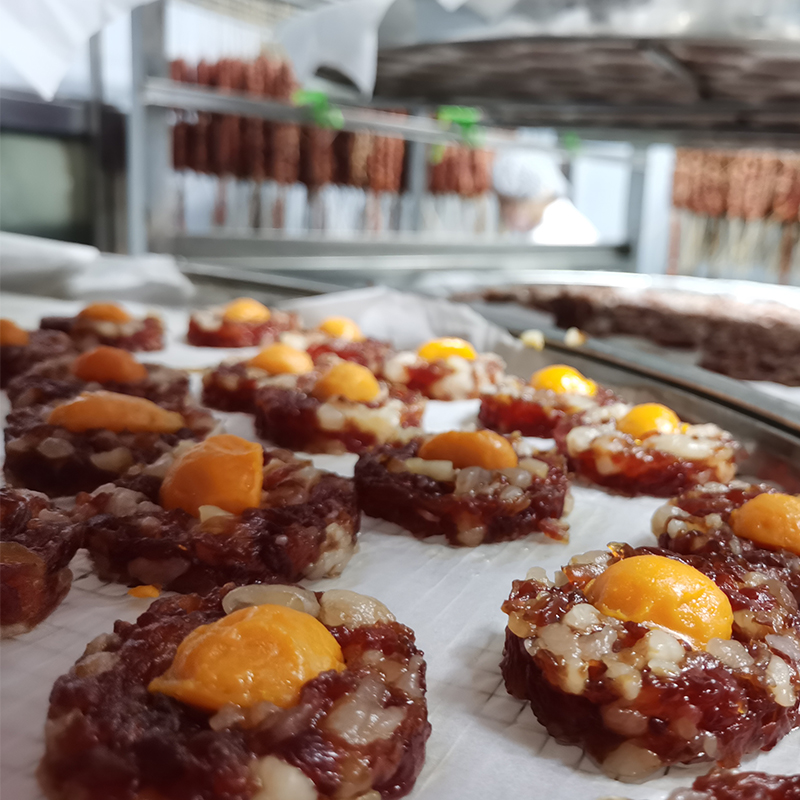 Gema de ovo salgada e hambúrguer de carne em conserva